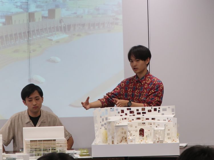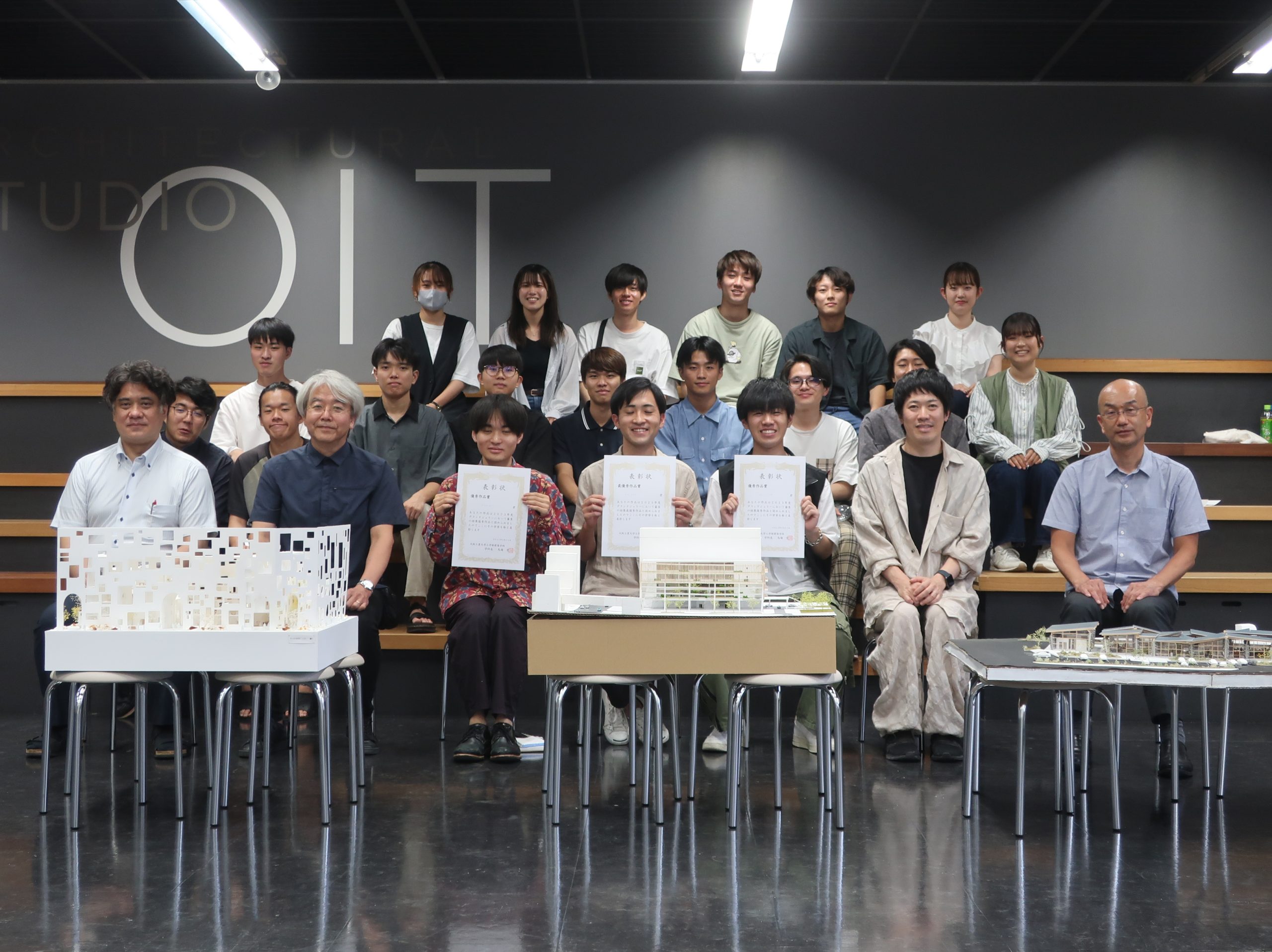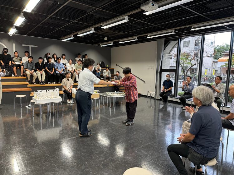 9月23日(土)、グランドジュリー2023が開催されました。グランドジュリーとは、大阪工業大学建築学科における設計演習の課題設計作品をブラッシュアップし、新たにCGを用いた図面や作り込んだプレゼンテーション用模型を制作し、学外から審査委員を招聘して、審査・講評いただくものです。課題設計における成果を見直し、学外の審査委員から審査・講評いただくことで、学生の設計能力の向上や新しい目標へと向かうモチベーションの喚起につながっています。今年は、百枝優さん((株)百枝優建築設計事務所、九州大学BeCAT担当教員)、内野輝明さん(有限会社 内野設計)、谷口嘉彦さん(石本建築事務所 大阪オフィス代表)の3名に審査・講評をお願いしました。学内での審査の結果、今年は19作品が出展されました。まず、3名の審査委員が、ひとつひとつの作品を1時間かけて丁寧に審査し(写真1)、その上で、19名の作者がプレゼンテーションを行いました(写真2)。