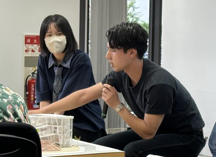 9月21日(土)、大阪工業大学建築学科にて「グランドジュリー2024」が開催されました。このイベントは、学生が設計演習の課題作品をさらにブラッシュアップし、新たにCGを使った図面やプレゼンテーション用の模型を制作し、学外から招聘された審査委員に審査・講評してもらうものです。外部の視点から評価を受けることで、学生の設計力を高め、新たな目標に向かうモチベーションの向上につながっています。今年は、松島茂樹さん(鹿島建設株式会社 関西支店建築設計部)、渡邊寿之さん(株式会社都市・計画・設計研究所)、笹岡周平さん(株式会社ワサビ)をお招きして審査をしていただきました。学内審査の結果、今年は25作品が出展されました。まず、3名の審査委員が1つ1つの作品を丁寧に審査し、その後、25名の学生がそれぞれプレゼンテーションを行いました(写真2)。